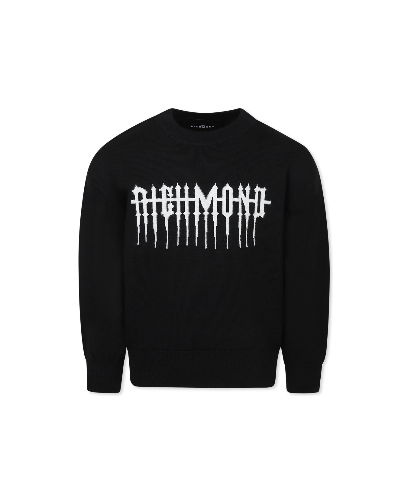 Black long-sleeved sweater with ribbed crew neck, cuffs and hem. It is embellished with jacquard logo on the front and logoed patch on the back.