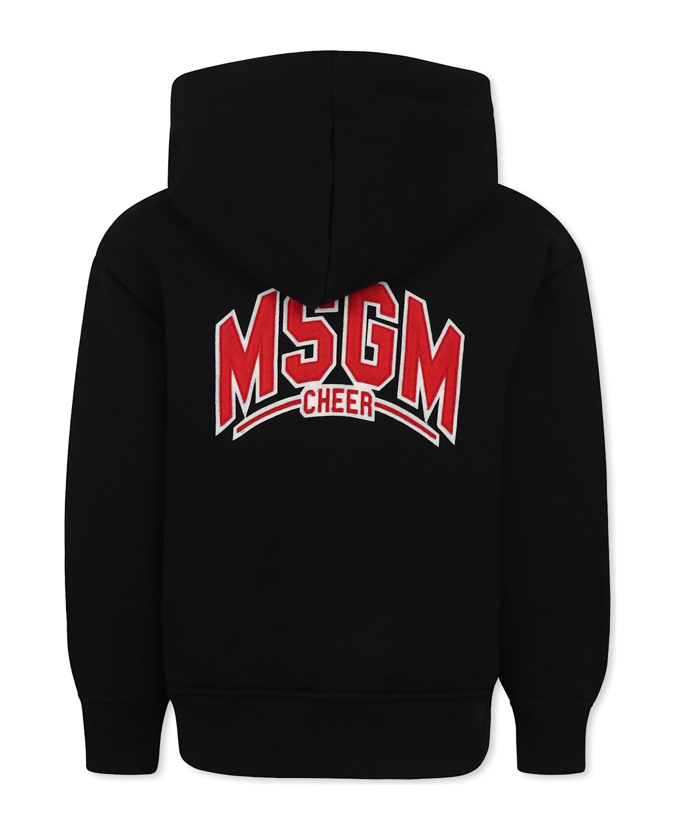 Black sweatshirt in fleece cotton, with long sleeves, hood, front pocket, ribbed cuffs and hem. It is embellished with red logo on the back and logo on the chest.