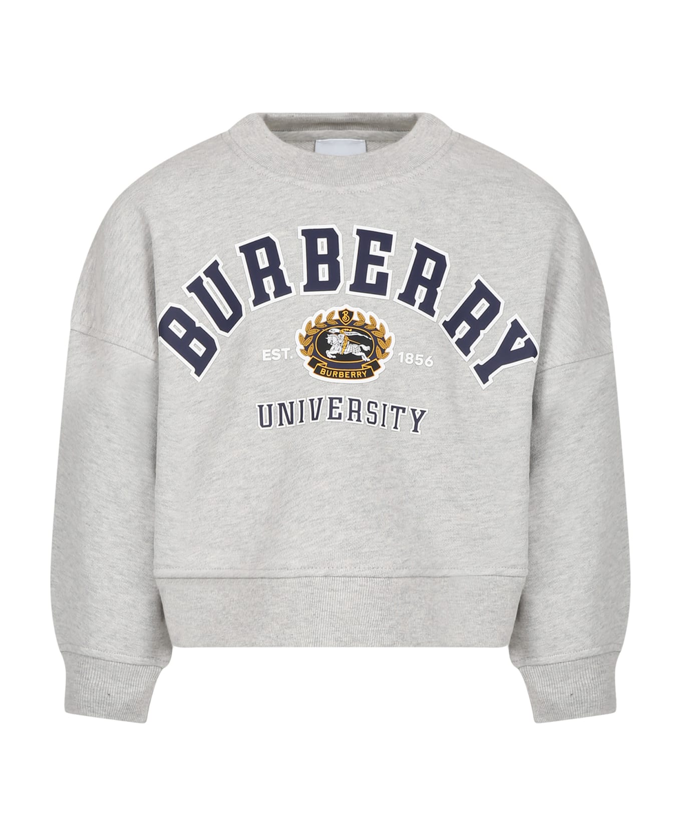 Grey sweatshirt in cotton fleece, with long sleeves, ribbed crew neck, cuffs and hem. It is embellished with logo and college print, on the front.