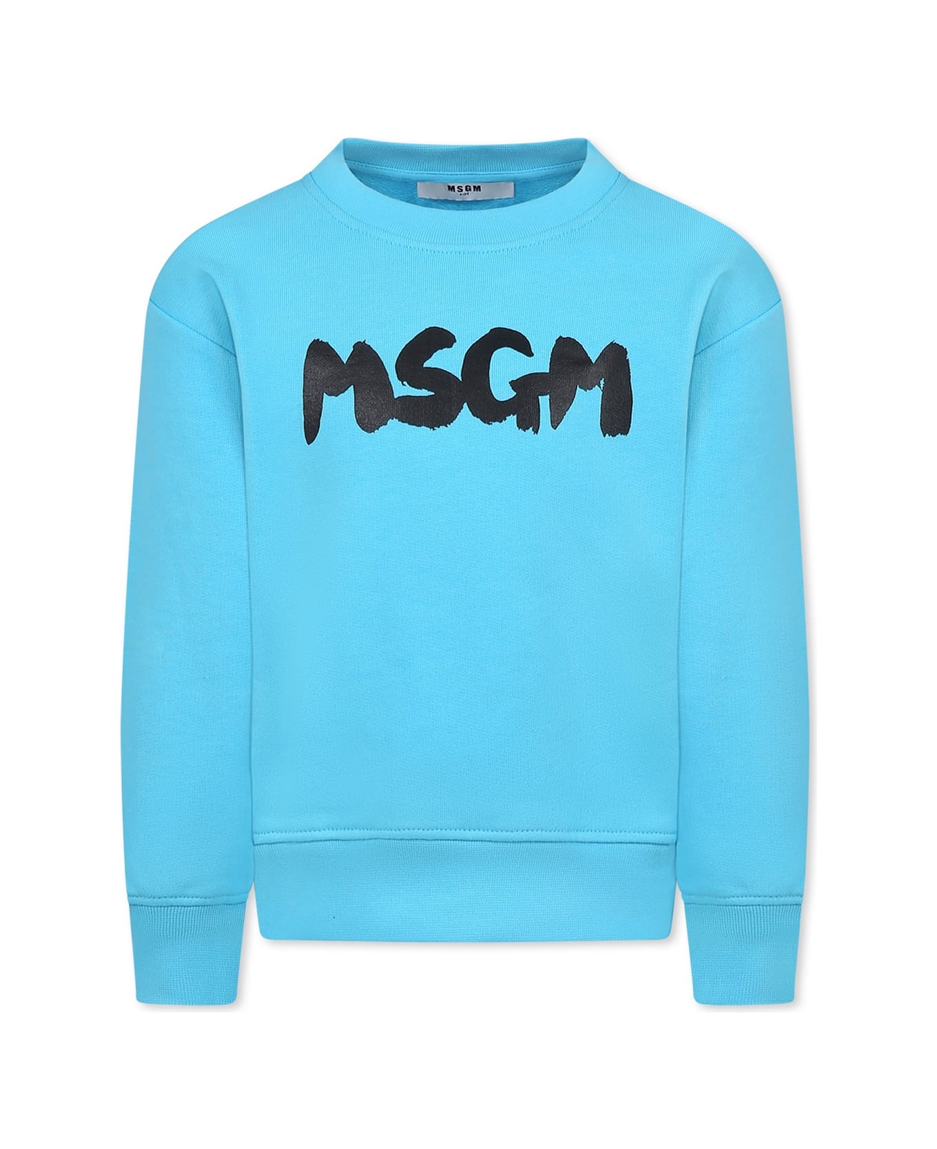 Light blue sweatshirt in brushed cotton, with long sleeves, crew neck, ribbed cuffs and hem. It is embellished with black logo on the front.