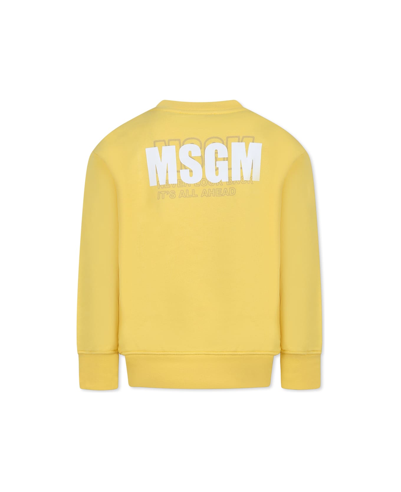 Yellow sweatshirt in brushed cotton, long sleeves, with ribbed crew neck, cuffs and hem. It is embellished with white MSGM logo printed on the chest and with logo and writing on the back.
