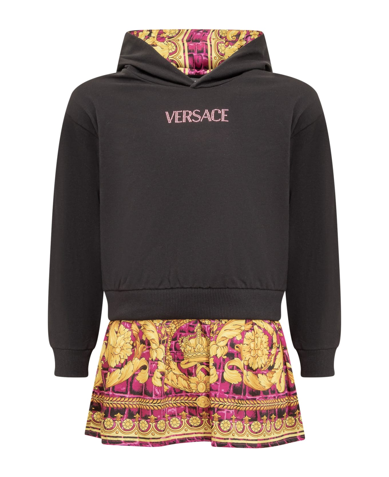 Black dress with long sleeves. Sweatshirt effect. Logo with rhinestones on the front. Skirt with print. Ribbed cuffs. Composition: 94% Cotton 6% Elastane, 100% Polyester
