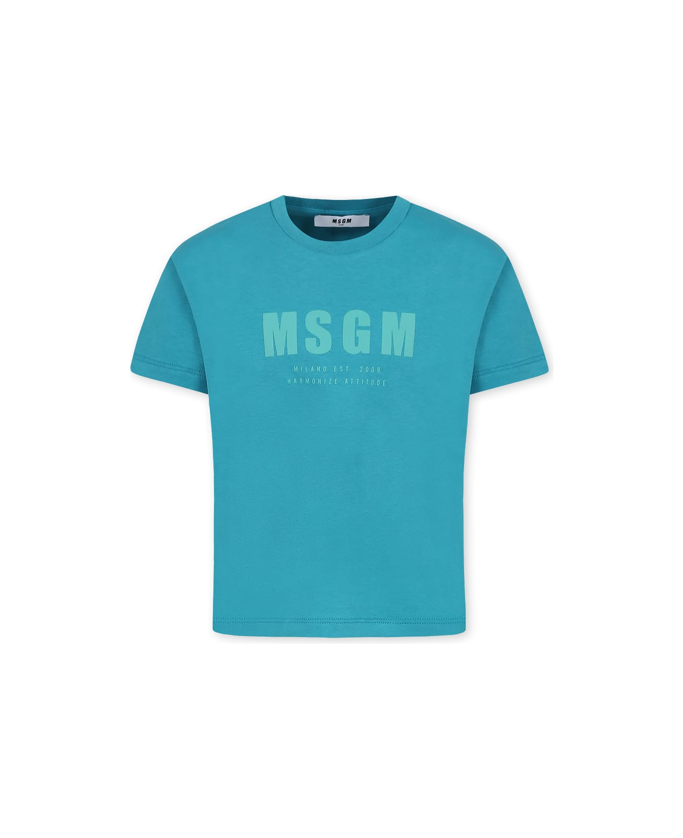 Green cotton t-shirt, with short sleeves and ribbed crew neck. It is embellished with rubberized MSGM logo and writing on the front and with logoed patch on the back.