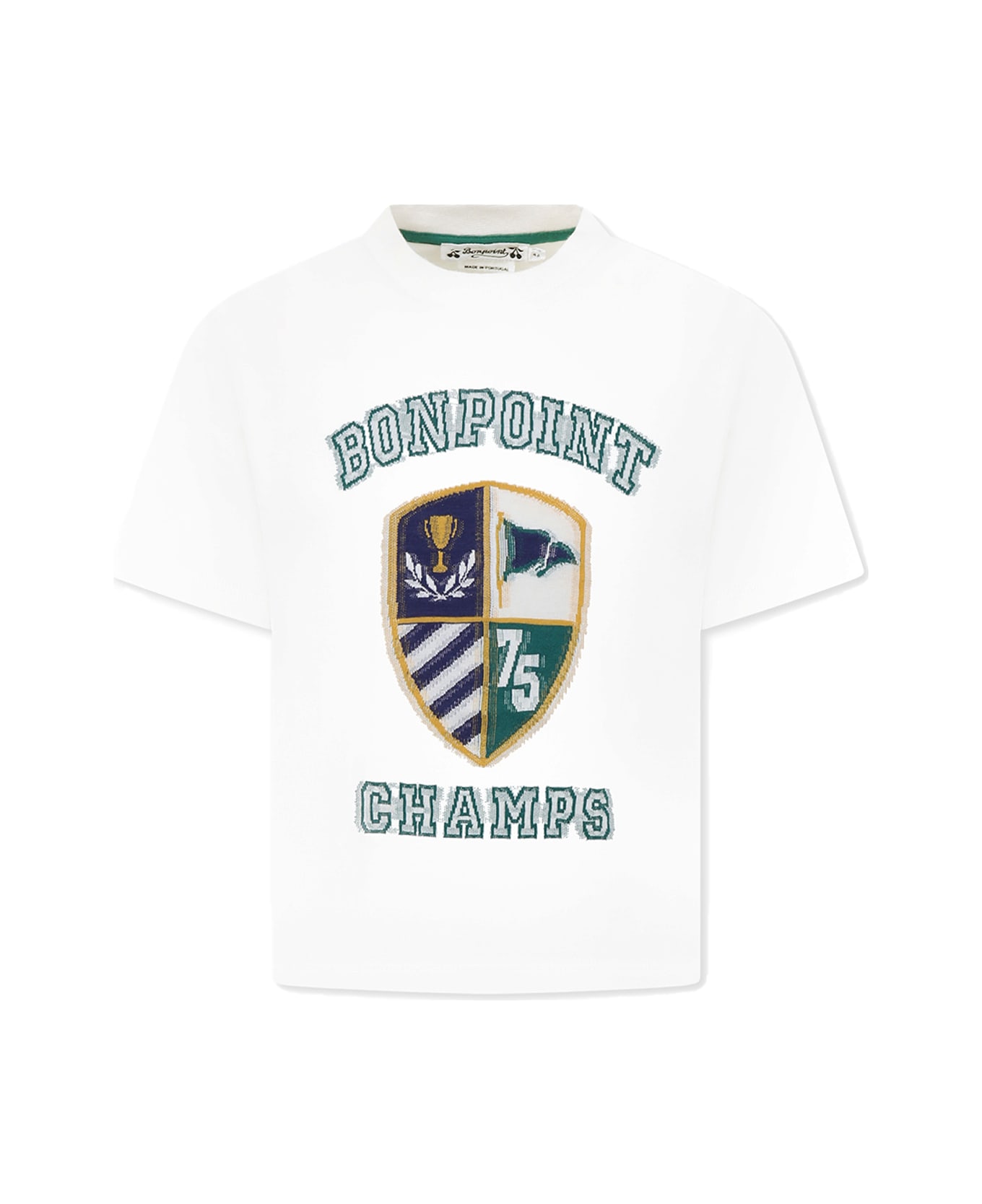 Ivory cotton t-shirt, with short sleeves and ribbed crew neck. It is embellished with logo and crest on the front.