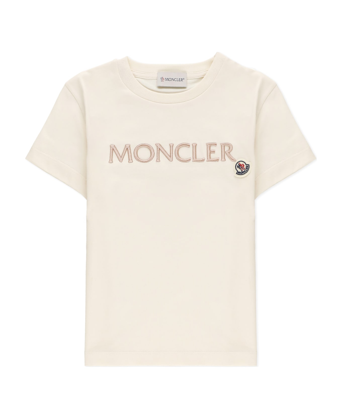 - Ivory Moncler Enfant cotton t-shirt for boy - Elastic ribbed round neckline - Short sleeves - Front contrasting color embroidered logo Composition: 100% Cotton