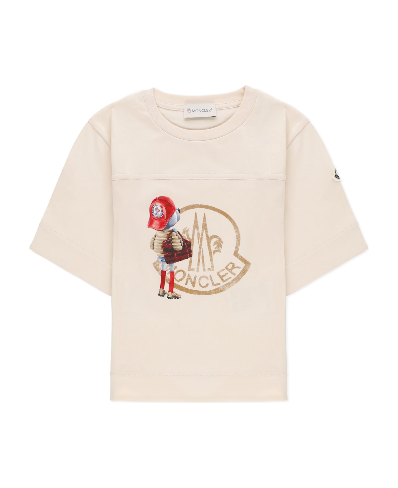 - Pink Moncler Enfant cotton t-shirt for boy - Crew neckline - Short sleeves - Contrasting color iconic logoed patch at left sleeves - Front contrasting color printed logo Composition: 100% Cotton