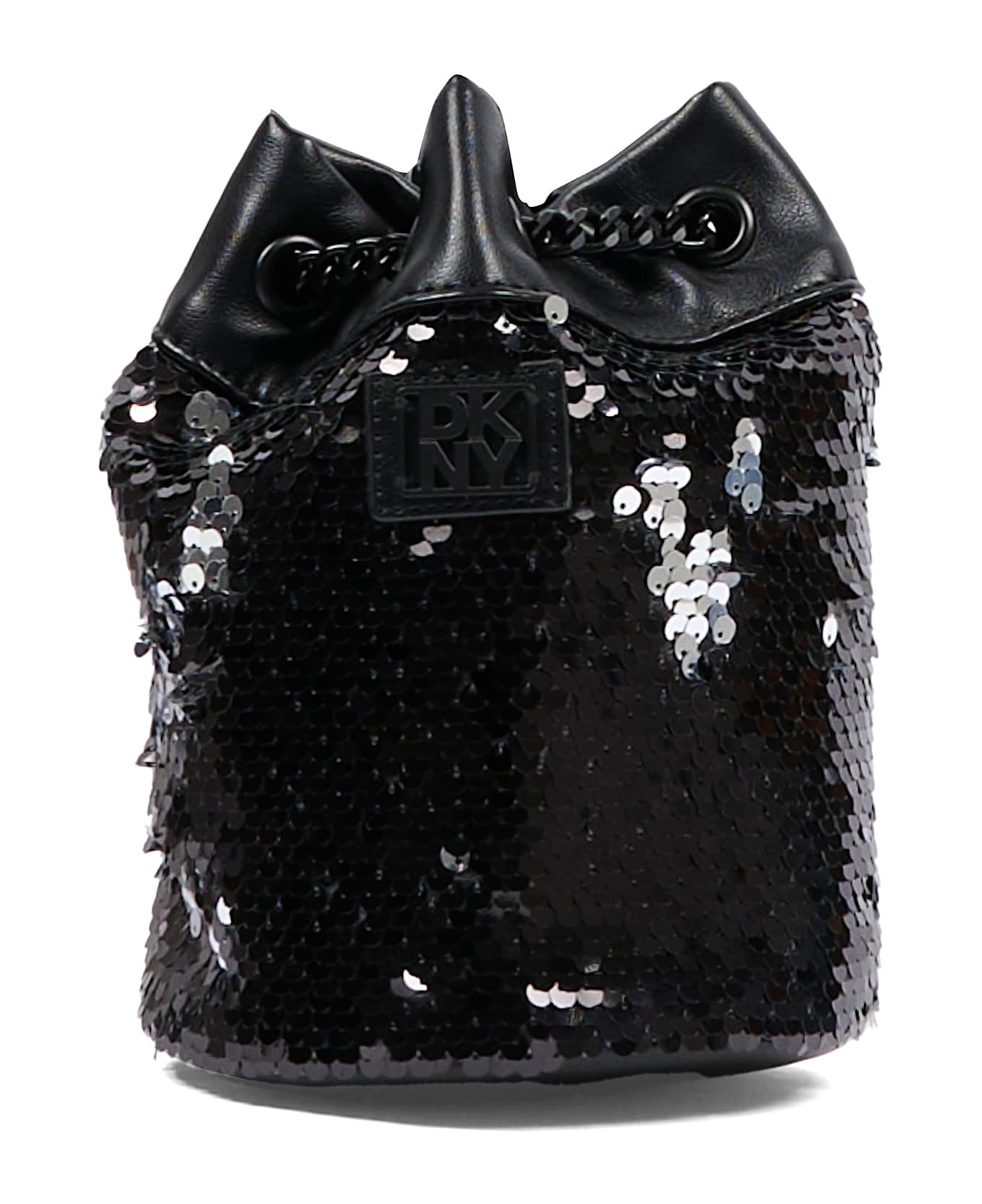 Black bag with reversible sequins and a chain shoulder strap; It is embellished with a metal logo on the front.