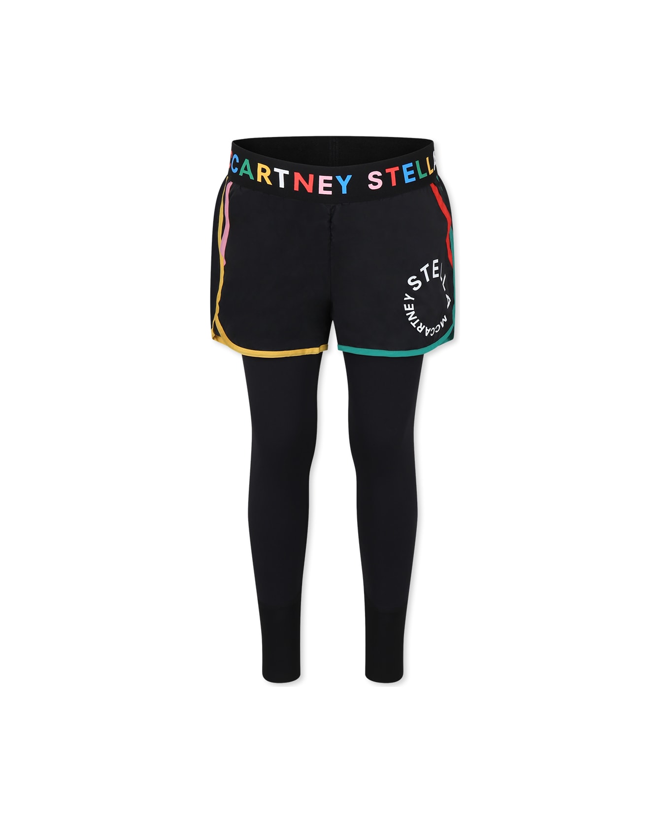 Black breathable leggings with integrated shorts, elasticated waist and side pockets; made of recycled polyester. They are embellished with a multicolor logo on the waist and a circular logo on the front.