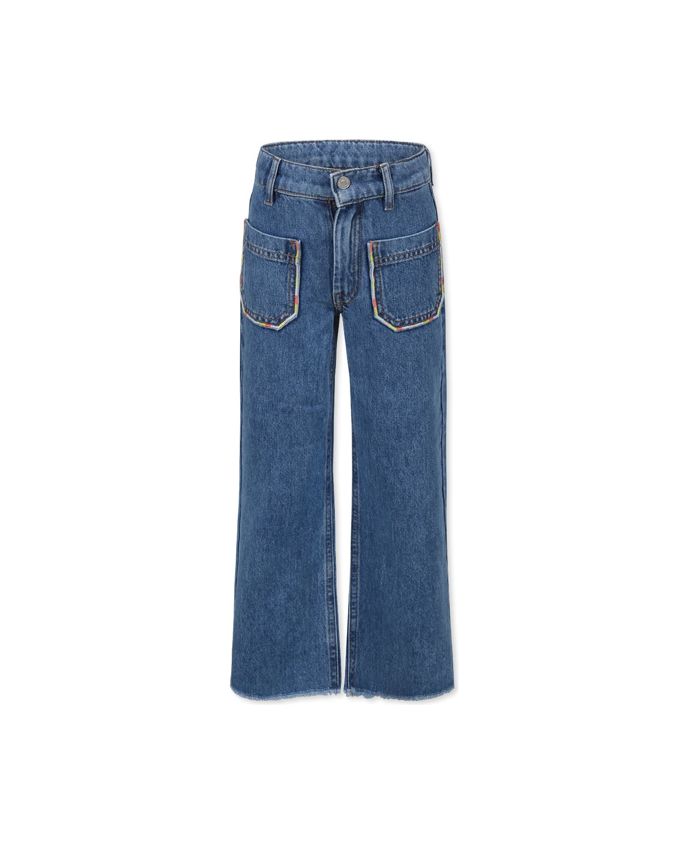 Organic cotton denim jeans, with front fastening with snap button and zip, adjustable waist thanks to internal elastic with buttons, patch pockets on the front, pockets on the back and frayed edges. They are embellished with sun and logo embroidered on the back.
