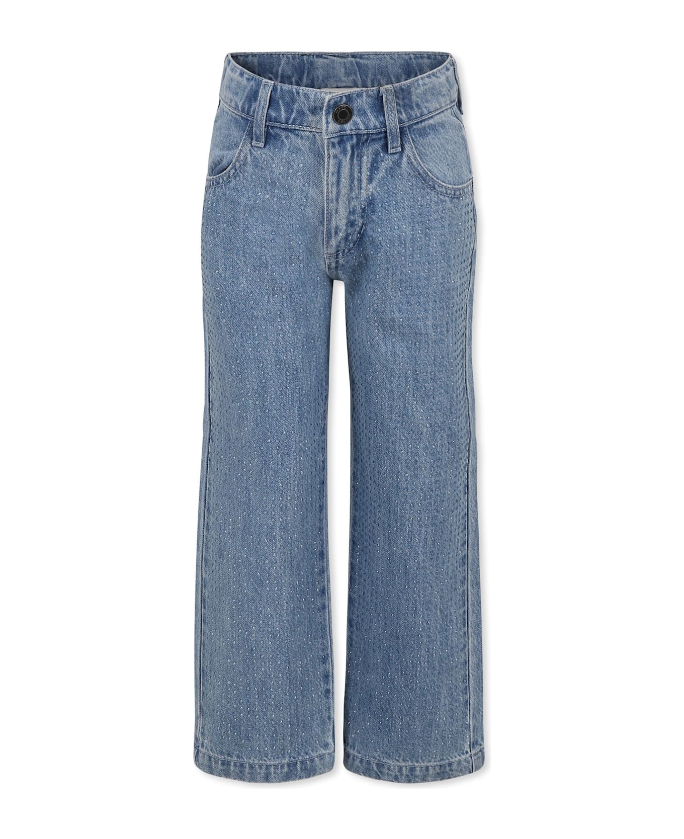 Denim jeans with belt loops, front zip and snap button fastening, adjustable waist thanks to internal elastic with buttons, side pockets and pockets on the back. They are embellished with all-over rhinestones and a logo patch on the back.