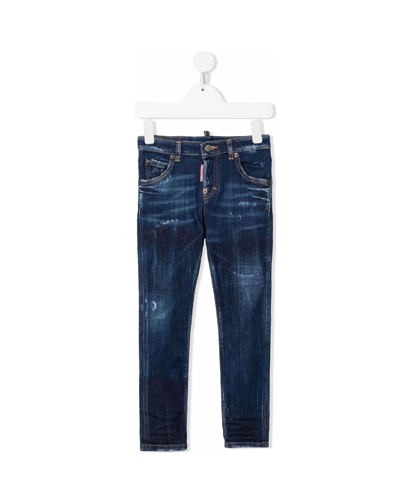 Slim fit jeans by Dsquared2 Kids made of dark wash blue denim with faded and worn effect. Model featuring contrast stitching, mid-rise, belt loops, button and zip fly, red front logo label, five pocket design and brown leather "DSQ2 Denim Since 1995" patch to reverse.