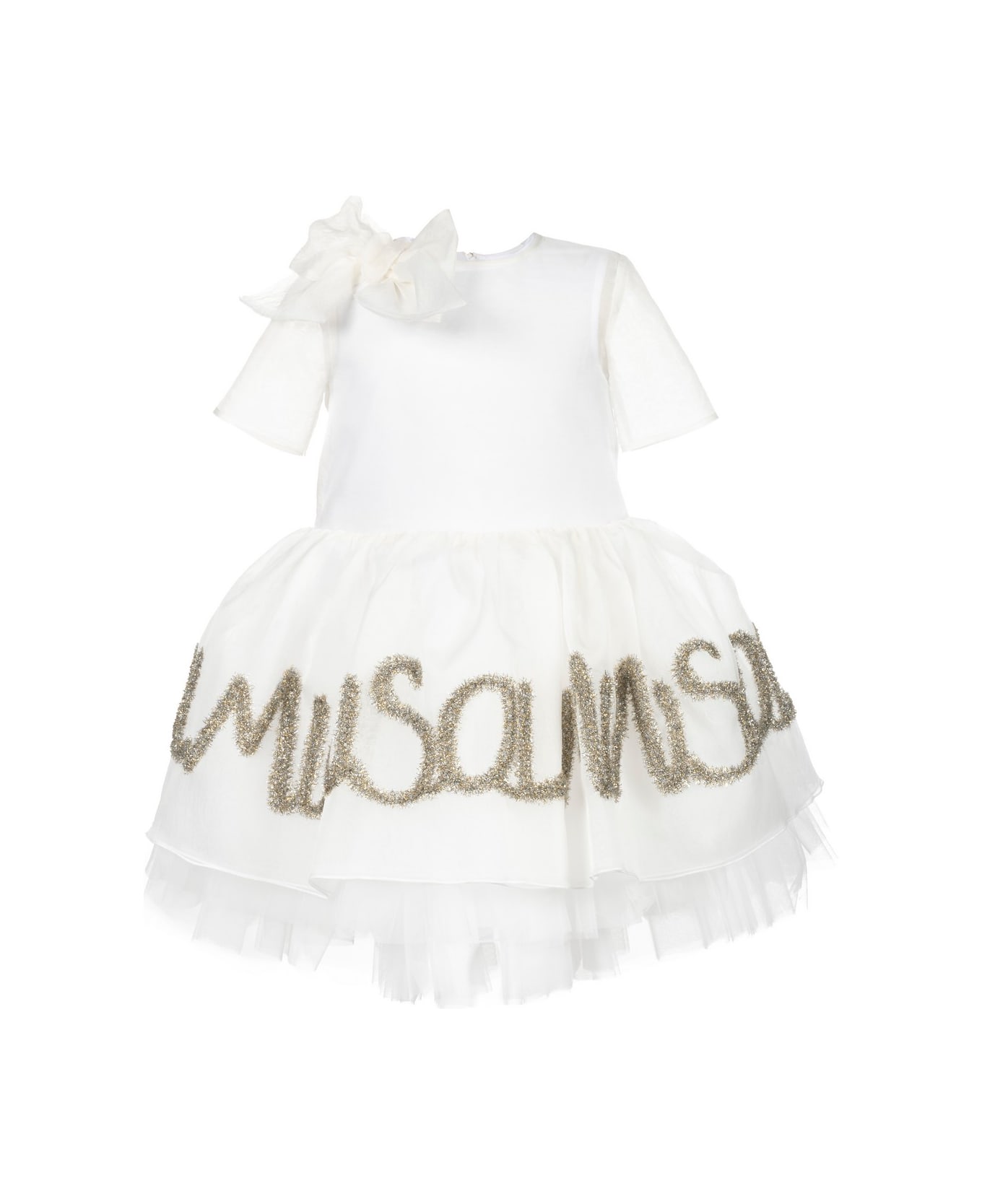 Cream white, silk, shiny detail, bow detail, round neck, back zip closure, short sleeves, full skirt and ruched hem. Origin: Italy Composition Outside: Polyamide 100%, Silk 100% Lining: Viscose 73%, Copolyester 27%