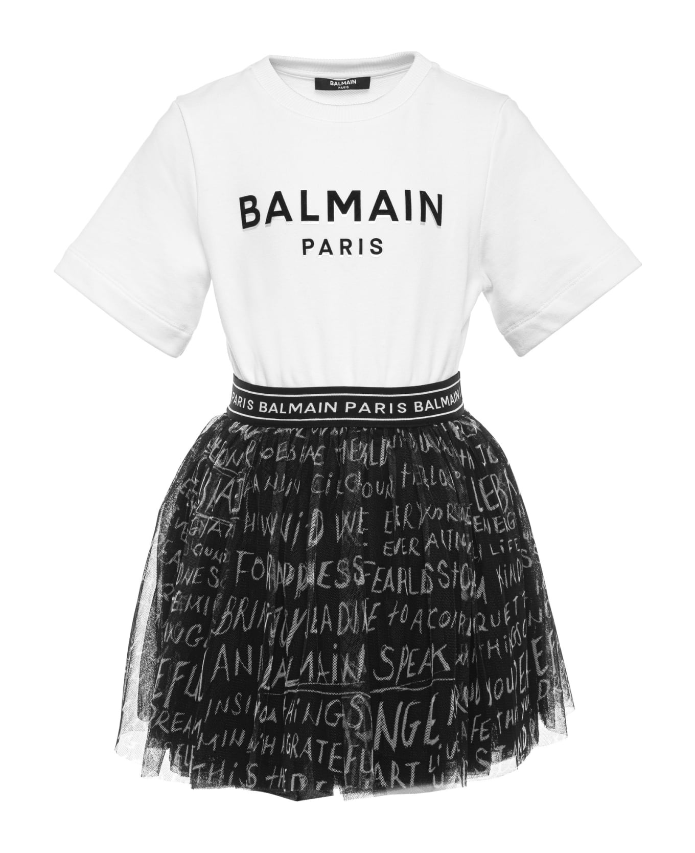 logo-print T-shirt dress from Balmain Kids featuring white/black, cotton blend, tulle netting, logo print to the front, crew neck, short sleeves and flared hem. Composition: Cotone, 100%