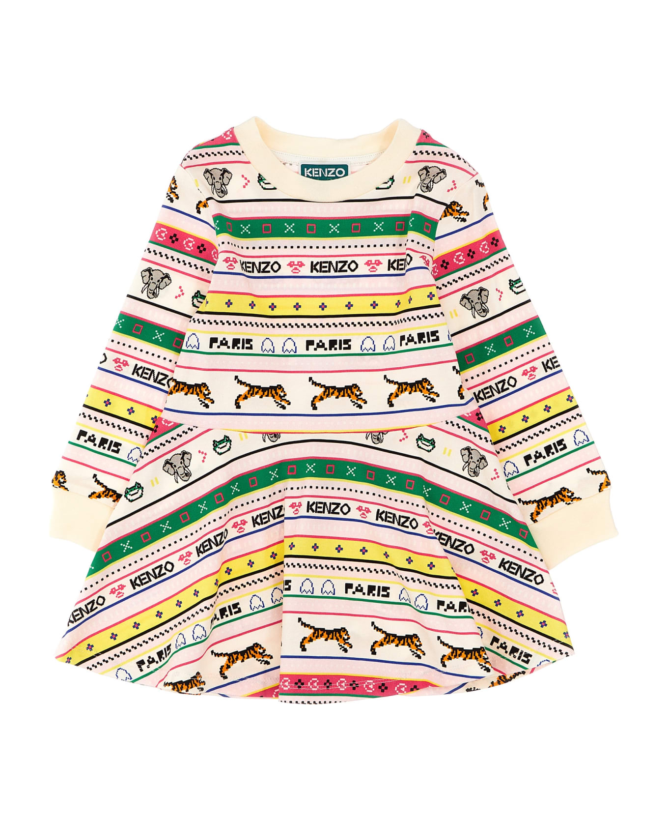 Stretch cotton dress with all-over print, crewneck, and long sleeves.