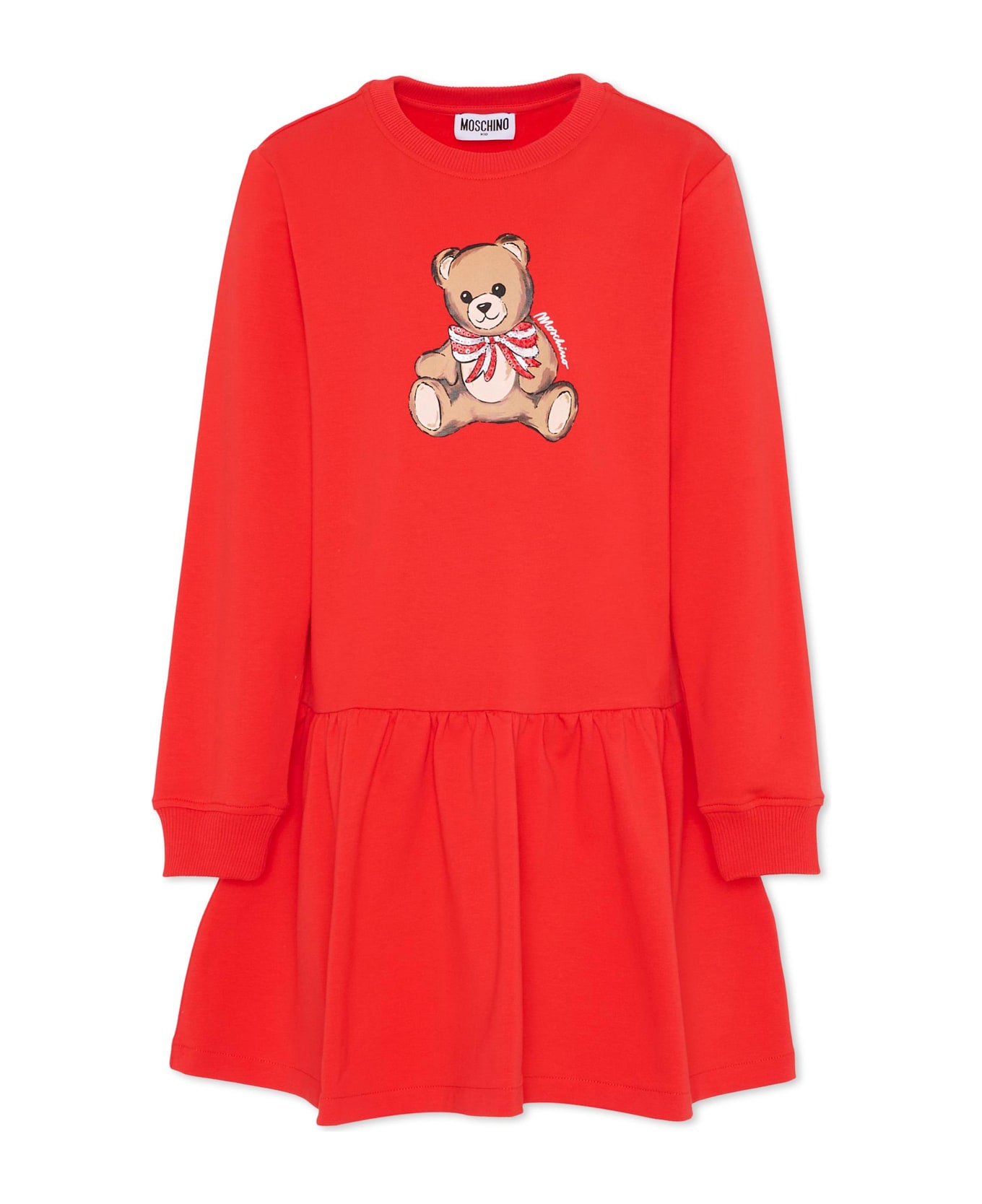Red dress from the Moschino Kids brand, made of a cotton blend, slightly fleeced, with long sleeves, a ribbed crew neck and cuffs, and a flounce at the bottom. It is embellished with a Teddy Bear print and a sequin bow on the front.