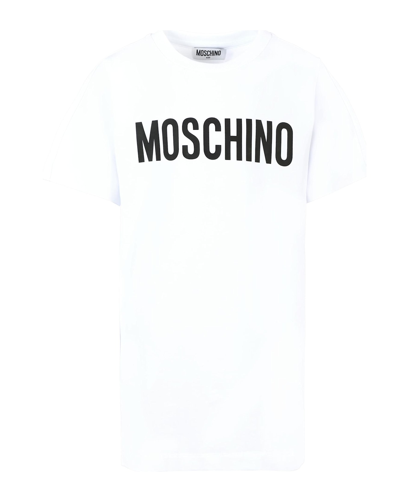 White dress from the Moschino Kids brand, in stretch cotton blend, with short sleeves, a ribbed crew neck and side pockets. It is embellished with a black logo print on the front.