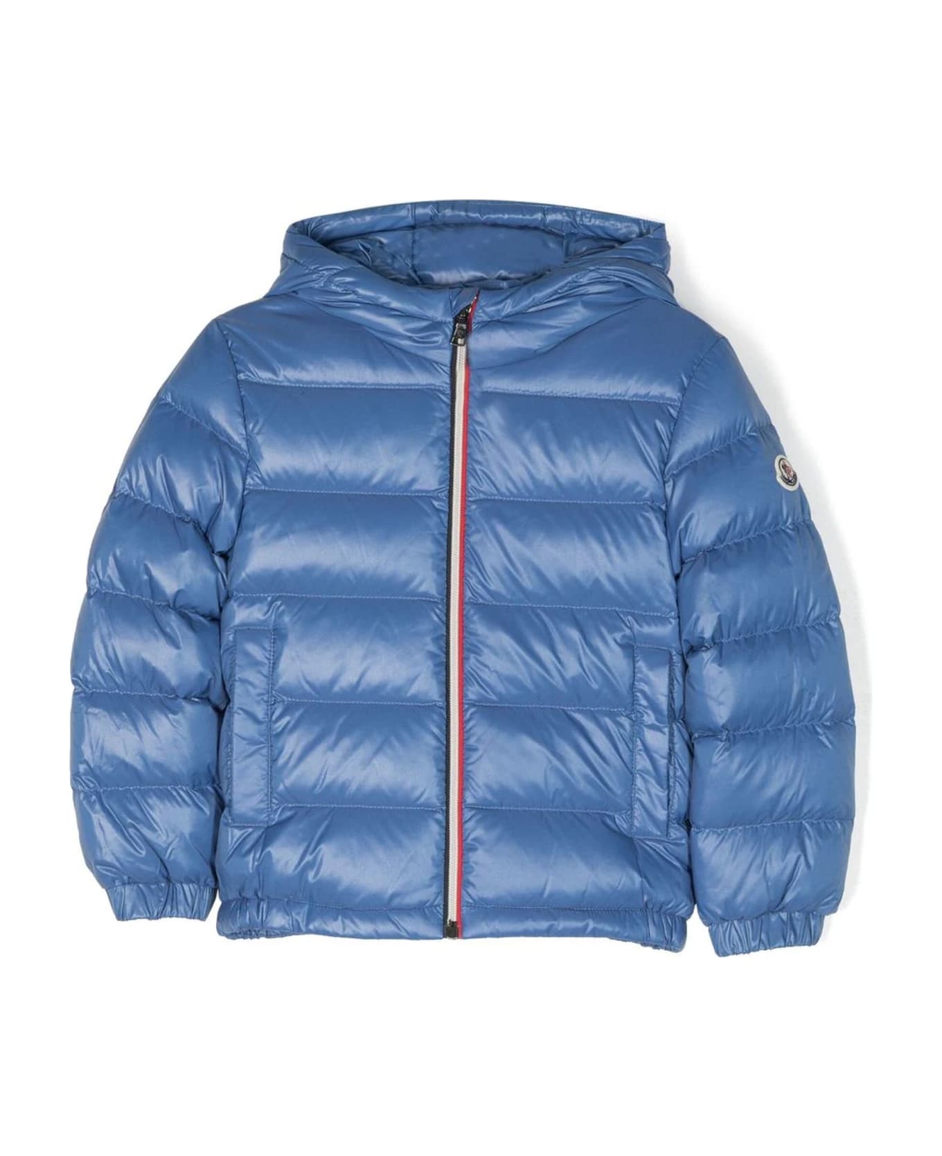 Iris blue down-feather jacket, padded design, logo patch at the sleeve, classic hood, front zip fastening, two side welt pockets, long sleeves, elasticated cuffs, elasticated hem Composition: Polyamide, 100%