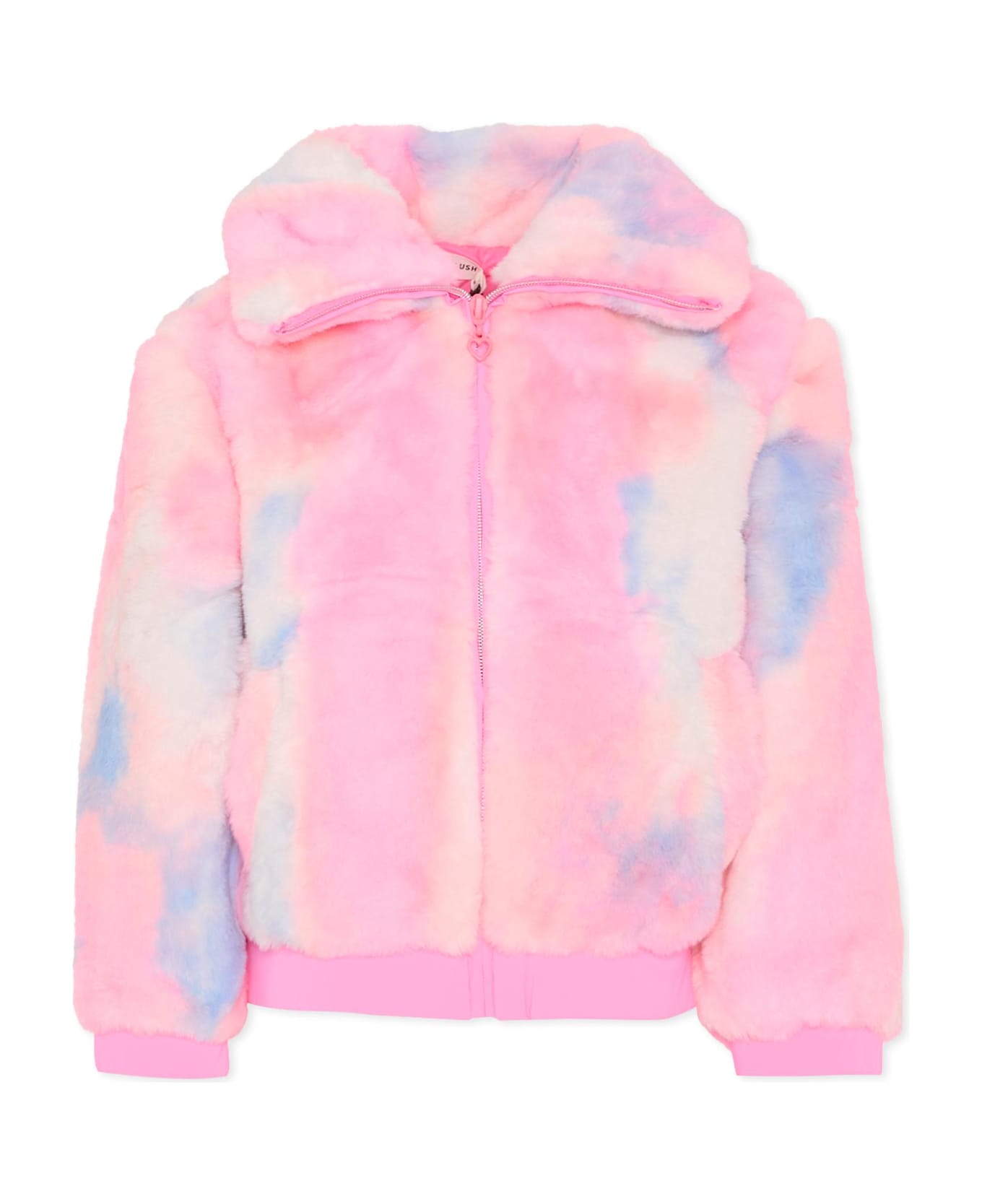 Pink long-sleeved faux fur coat, with pointed collar, front zip fastening, side pockets, ribbed cuffs and hem.