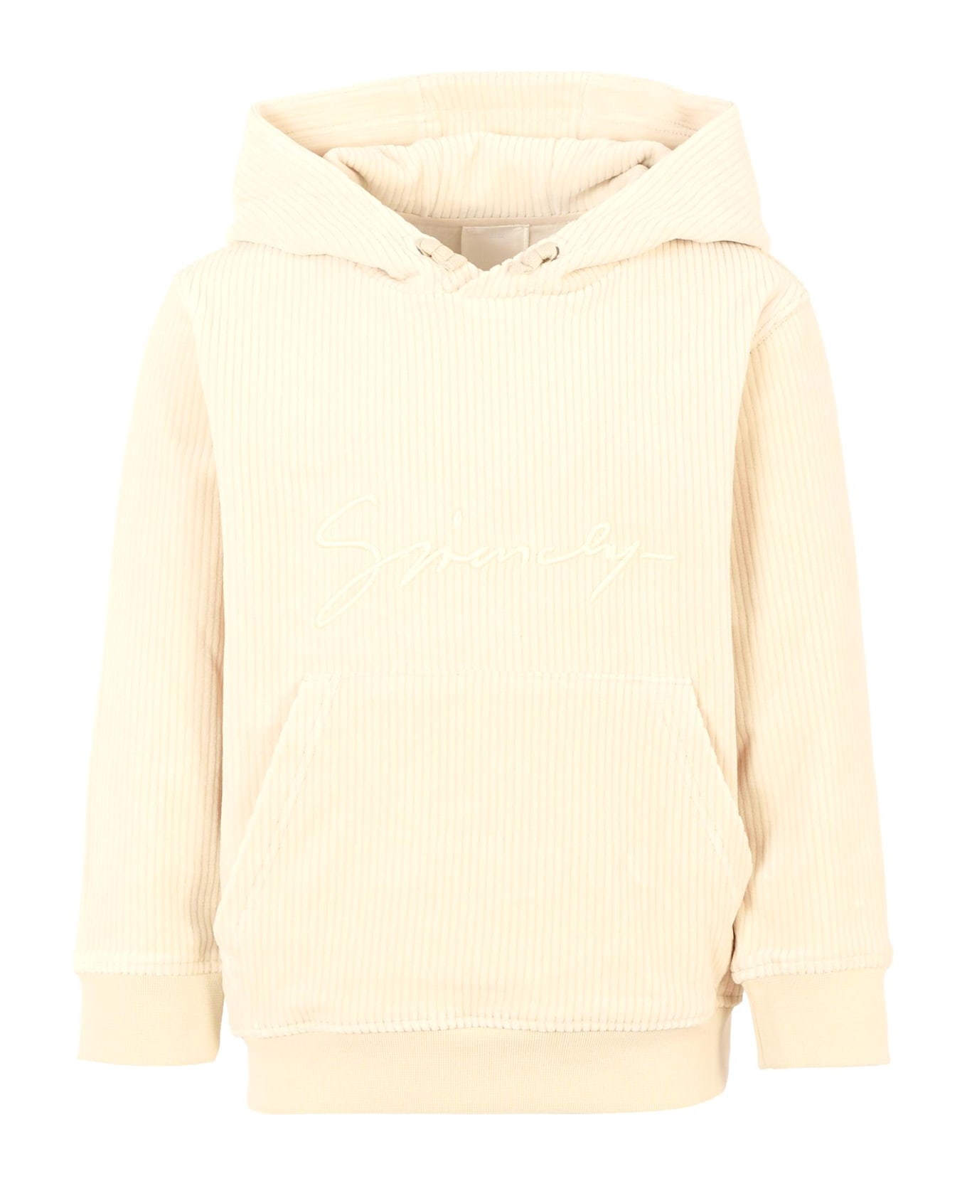 Ivory chenille sweatshirt from luxury brand Givenchy Kids, featuring long sleeves, a hood, a front pocket, and ribbed cuffs and hem. It is embellished with the Givenchy logo embroidered on the front.