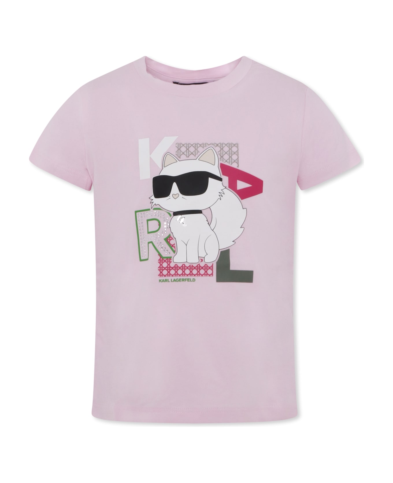 Pink organic cotton blend t-shirt, with short sleeves and ribbed crew neck. It is embellished with Choupette print on the front and with logo on the back and front.