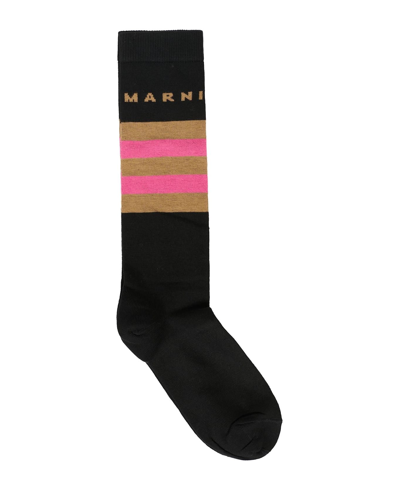 Black cotton socks with ribbed hems. They are embellished with fuchsia and brown bands and brown logo.