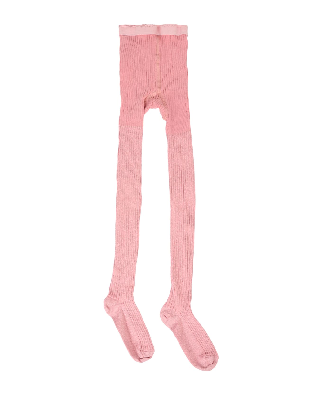 Pink ribbed lurex tights with scalloped elastic waistband.
