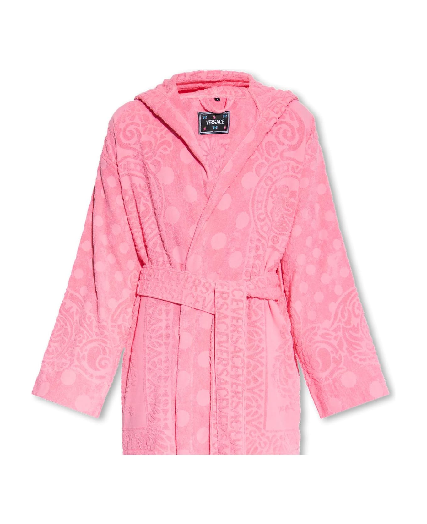 Pink bathrobe with a hood from Versace x Dua Lipa, the 'La Vacanza' collection. Crafted from terry cotton, this style is cinched with a tie belt at the waist and showcases the brand's logo and 'Seashell Baroque Polka Dot' pattern.