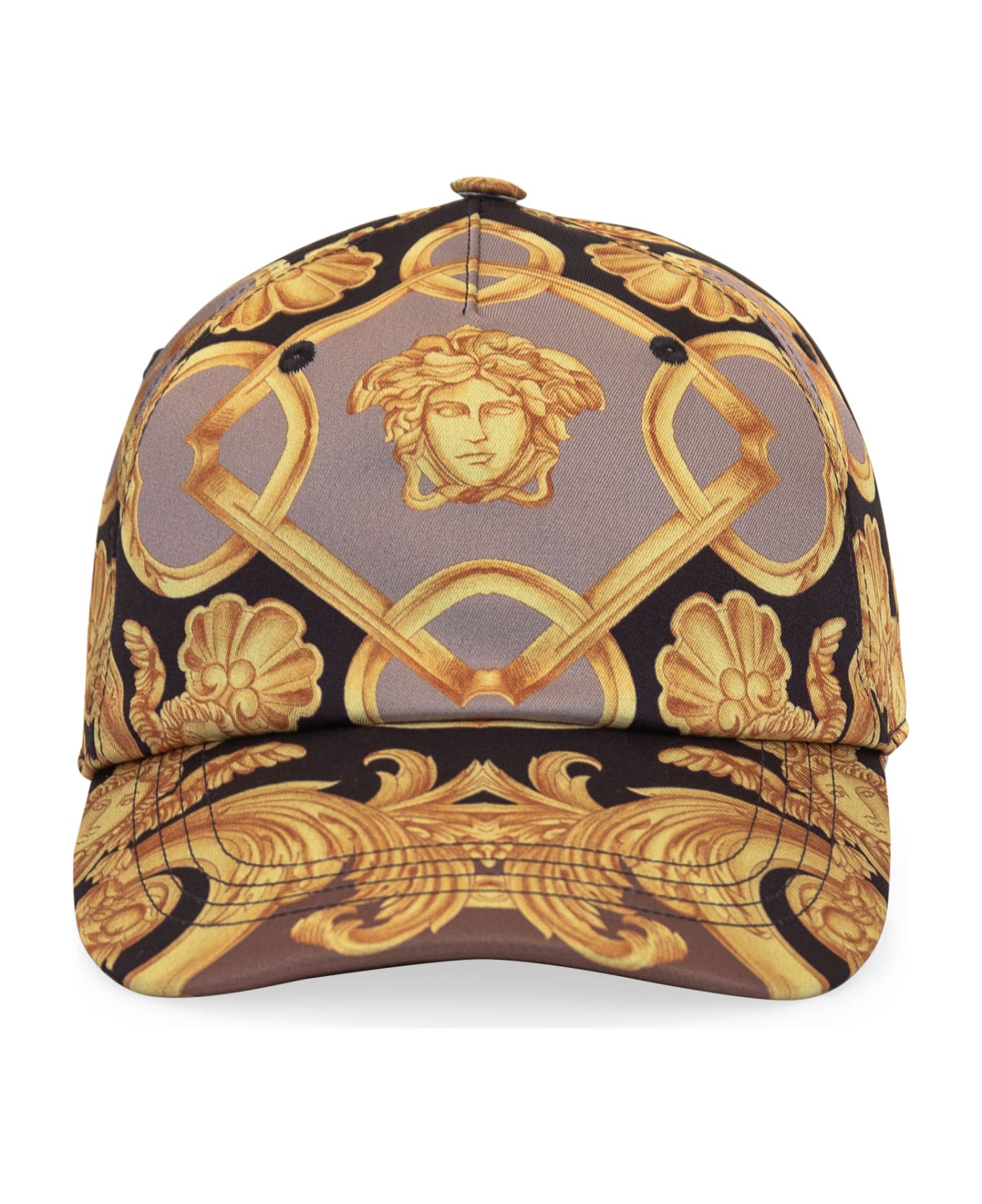 Baseball cap. Curved visor. Strap on the back with Medusa. Logo embroidered on the back. Barocco print all-over. Composition: Outside:, 100% Polyesterlining:, 100% Cotton