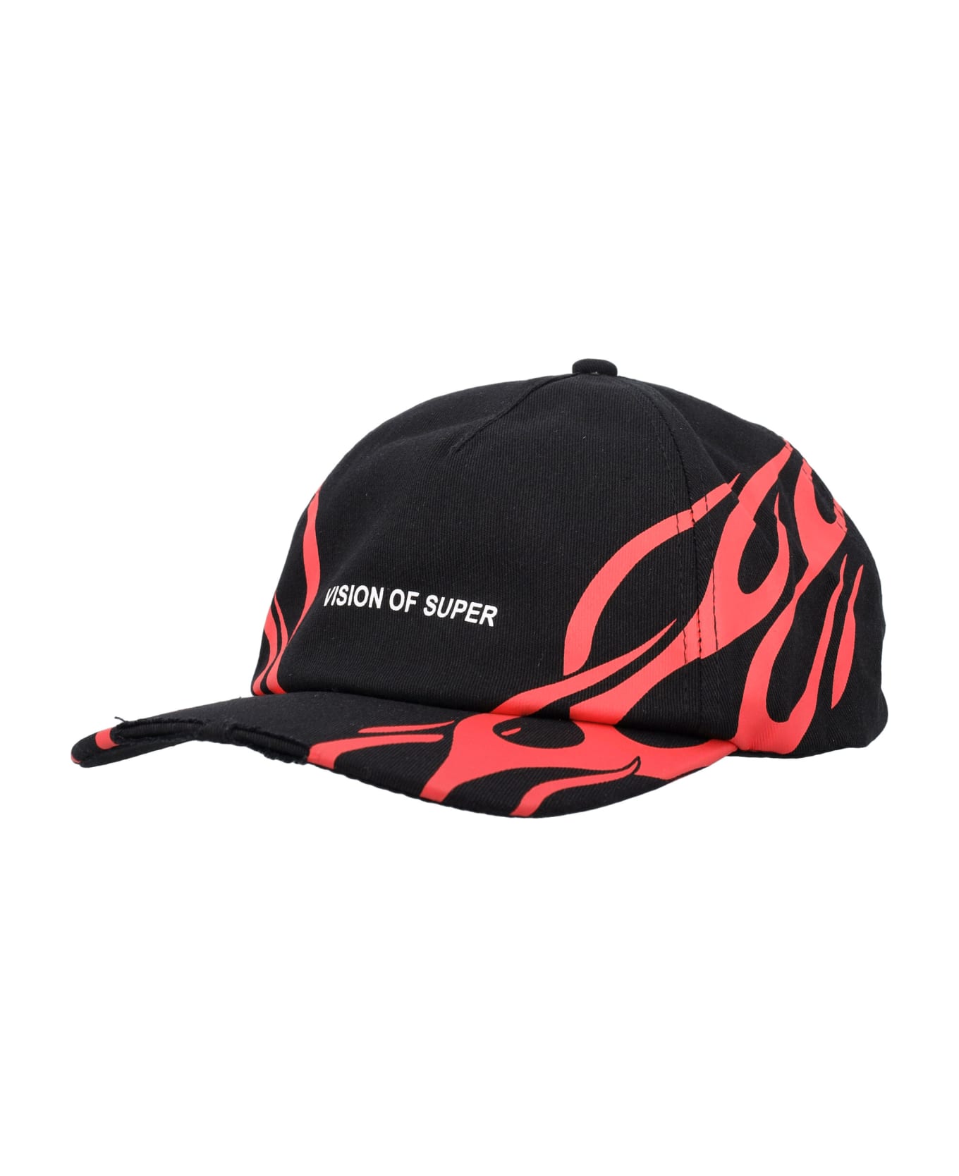 Cotton Flames Print Hat By Vision Of Super. Featuring: Curved Peak Logo Print At Front Red Flames Print Distressed Detail Adjustable Velcro Strap Fastening With Logo At Back