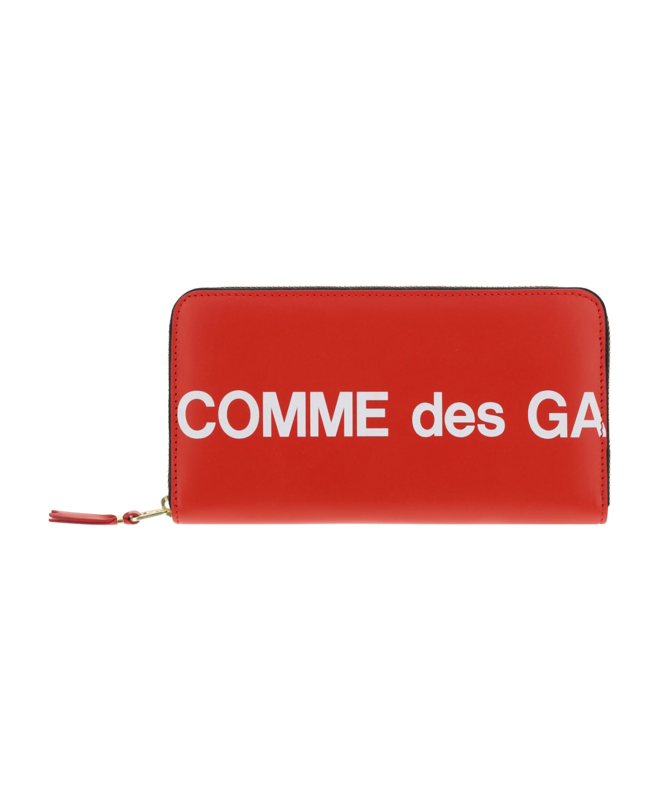 Calfskin wallet by comme des garçons, zip-around closure, contrasting printed logo on front and back, interior card slots, double interior compartment, interior coin pocket. Composition: 100% % Calf Leather Bos Taurus