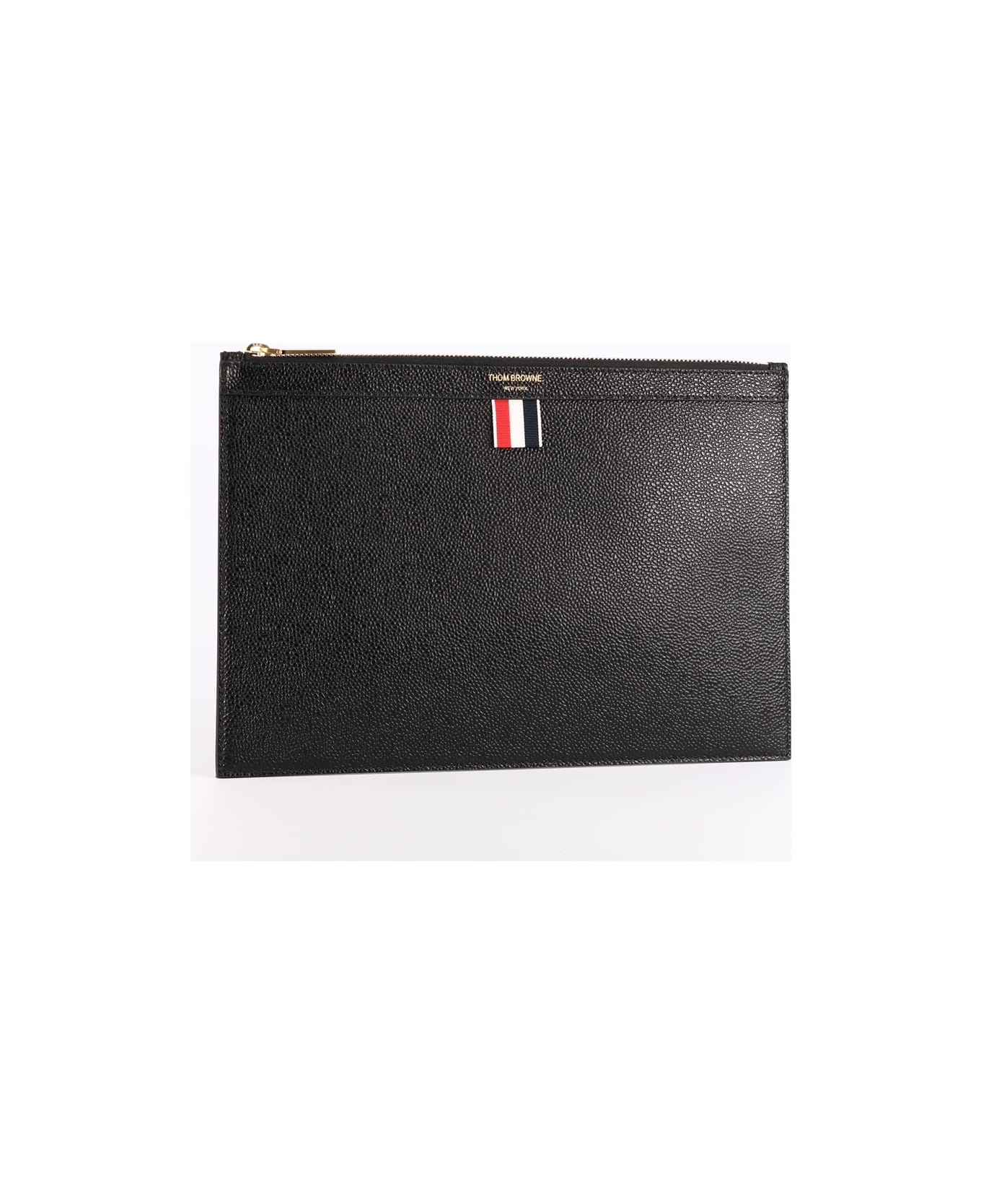 Document holder in black grained calfskin with tricolor grosgrain detail and Thom Browne logo on the front. Zip closure, one single interior compartment and interior tricolor lining. Dimensions: 20x29,5cm