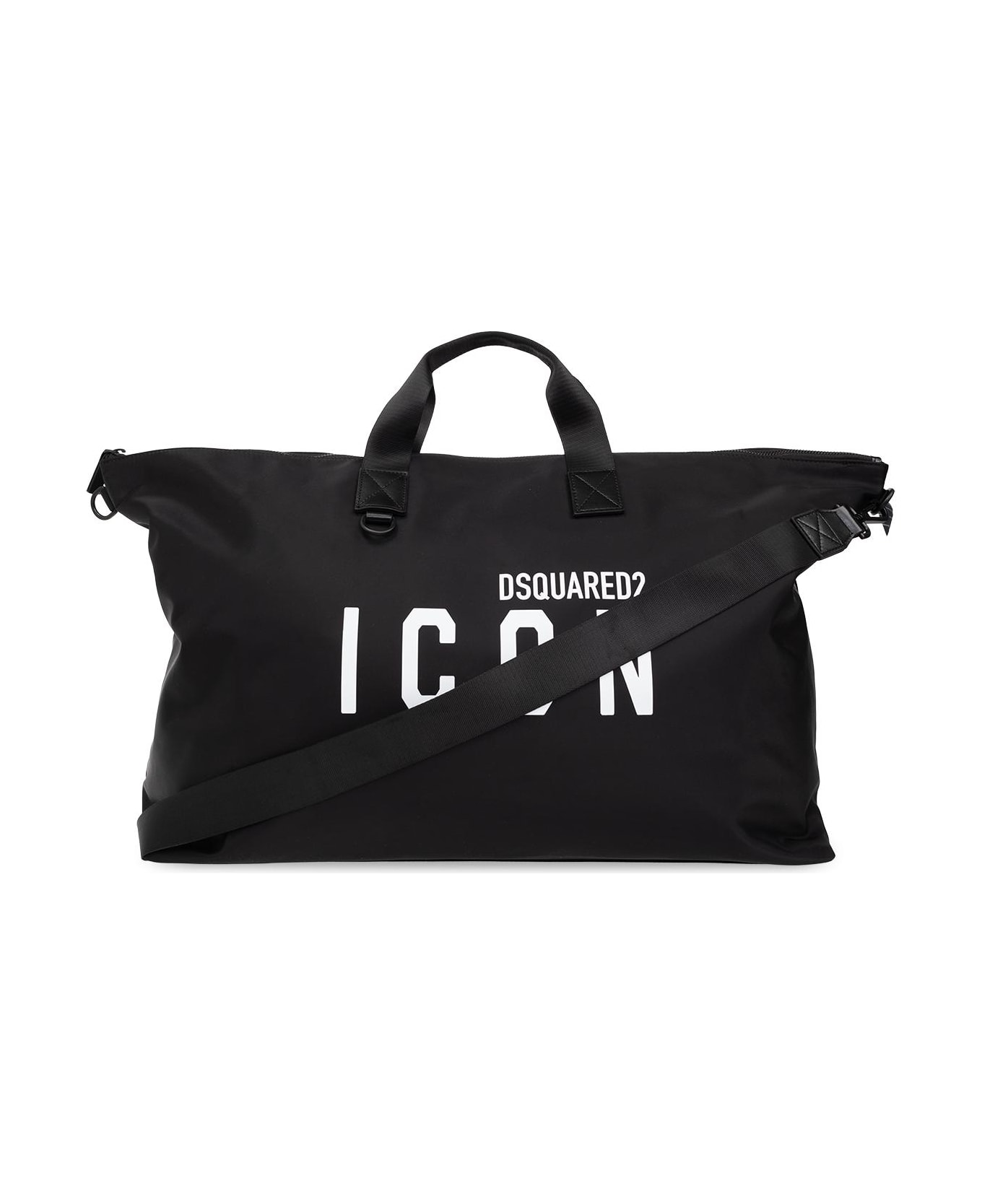 Black duffel bag from Dsquared2. Crafted from fabric, this design fastens via a zip and showcases a printed white logo on the front, two half-round handles and one internal compartment with one zip pocket and two slip pockets.