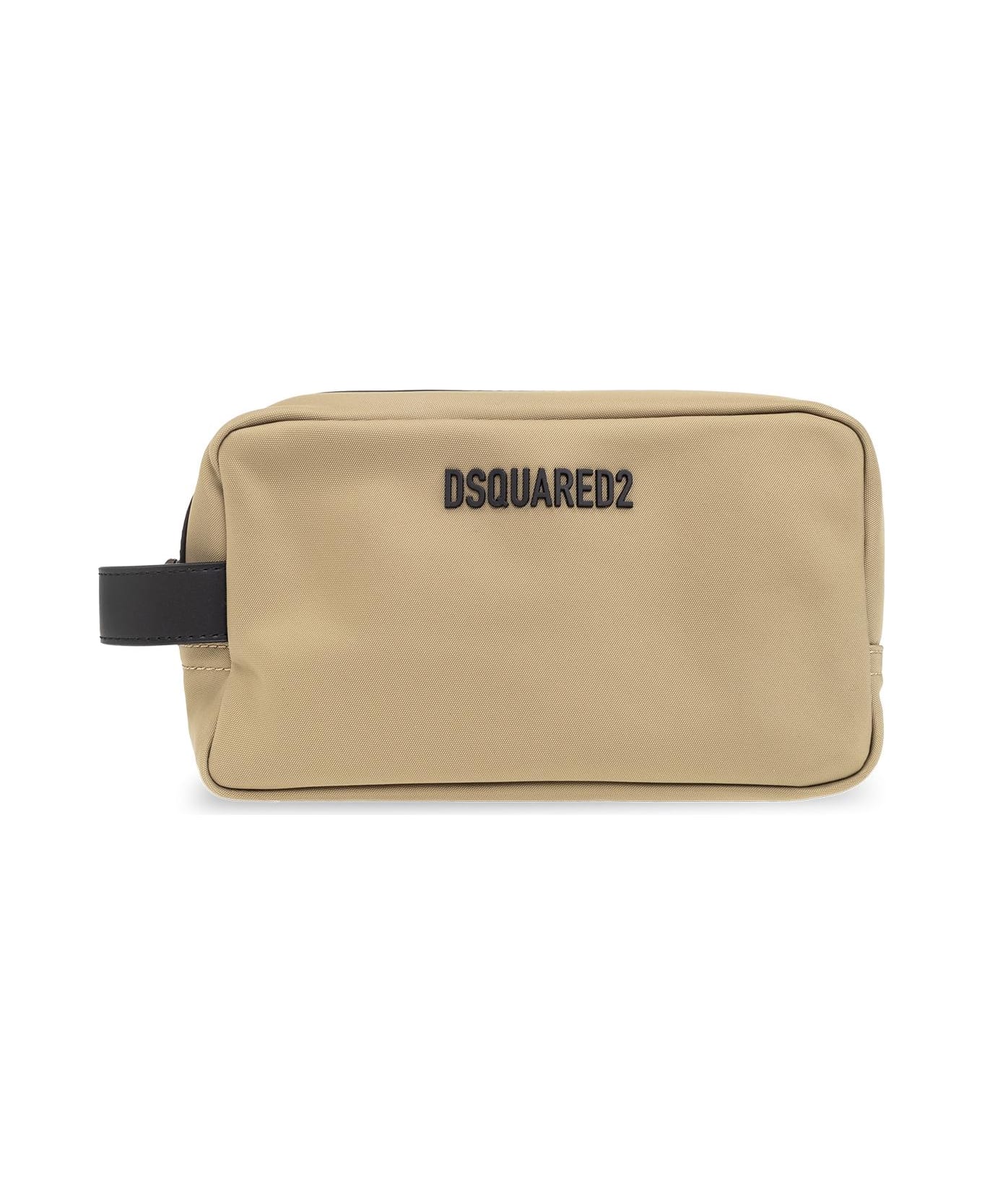 Beige and black wash bag from Dsquared2. Made of fabric trimmed with leather, this model features a zip fastening, raised logo on the front, zip pocket at the back, half-round handle on the side and one internal compartment with one slip pocket.