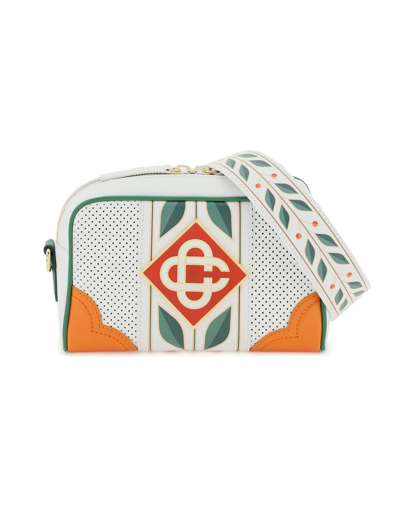 CASABLANCA "Laurel" crossbody bag crafted in perforated leather with contrasting inserts and enameled metal logo patch. Two-way zippered closure, twill interior with one open pocket and detachable decorated shoulder strap Gold-finished metalware.