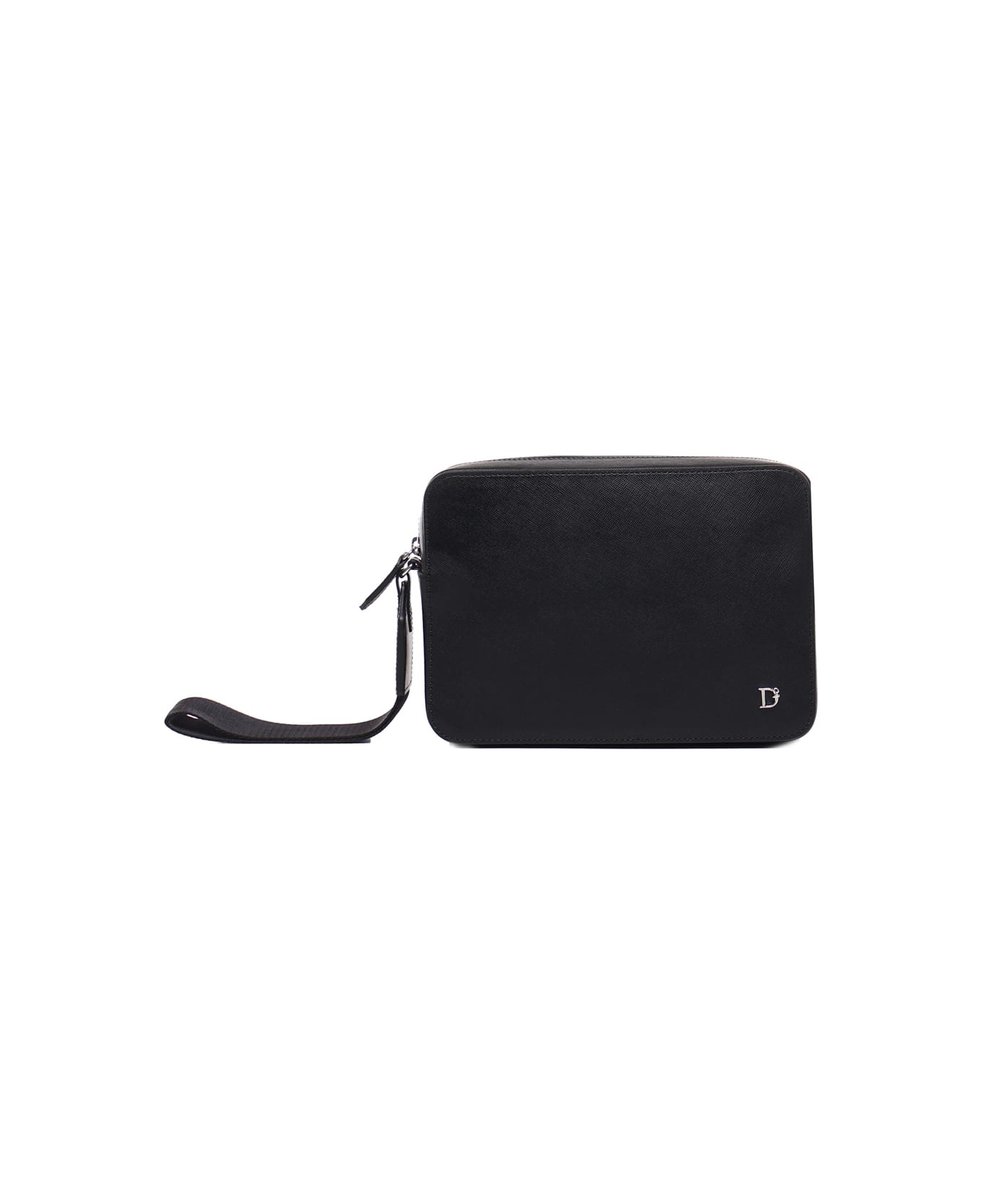 Black Statement Clutch from Dsquared2 -Leather pochette -Gros grain strap -Engraved logo writing -Front metal logo detail -Zip closure -Lined -Made in Italy -Colour: Black -100% Leather