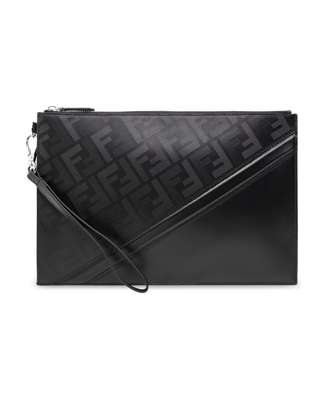 Black handbag from Fendi. Made of leather, this model features a zip fastening, textured monogram, zipped back pocket, detachable wrist strap on the side, silver-tone metal hardware and one internal compartment with three slip pockets and six card slots.