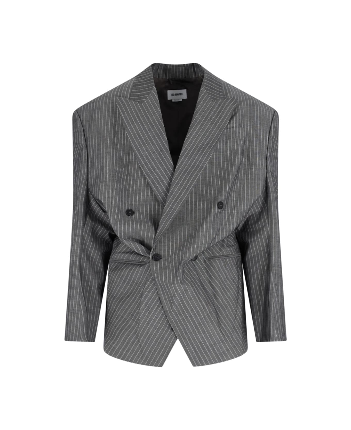 Hed Mayner double-breasted virgin wool and mohair grey blazer with pinstripe pattern, peak lapels, button closure, draped details, chest pocket, two side pockets, button cuffs, straight hem.