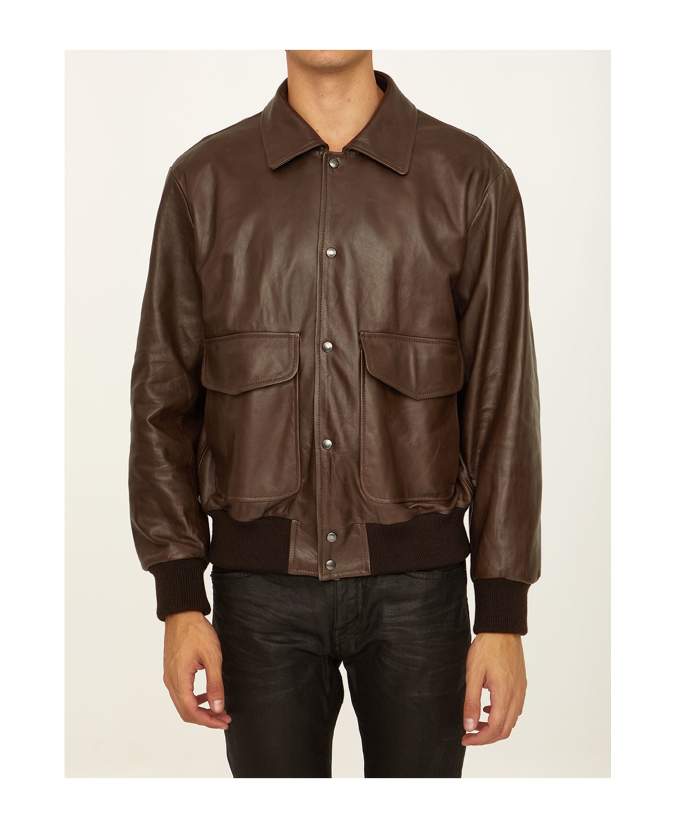 Brown calfskin jacket with ribbed knit inserts on cuffs and hem. It features shirt collar, front press-stud closure and two maxi flap pockets on the front.