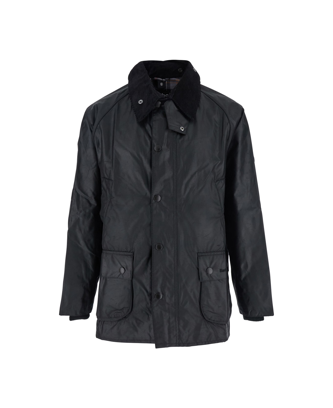 Jacket Black Velvet collar Long sleeves Button closure Waxed coating Two welt pockets on the chest Embroidered logo on the front Two flap pockets on the front Inner pocket with zip Checkered lining Straight hem Tech fabric Regular fit