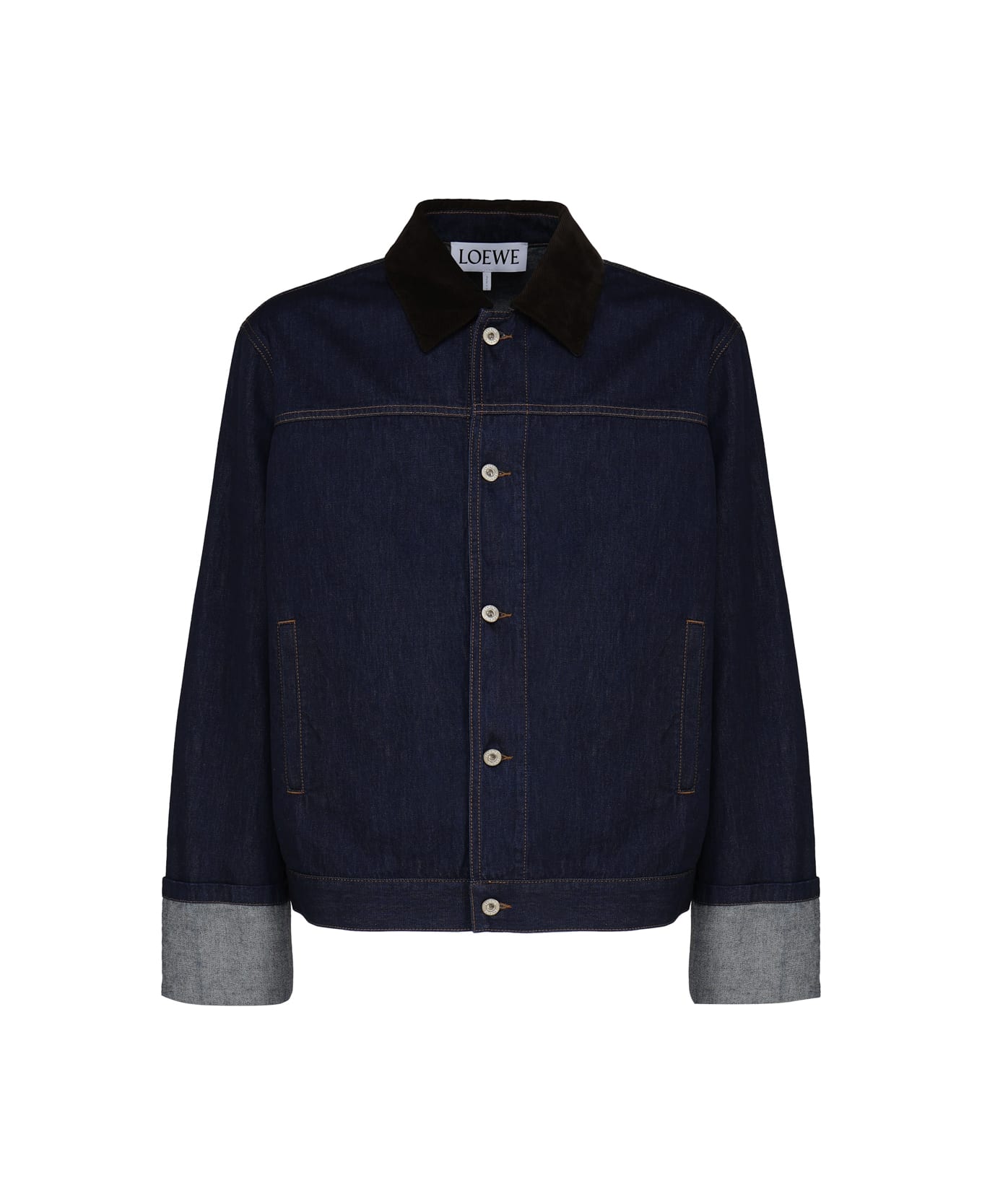 Indigo Fisherman Jacket With Denim Turn-up from Loewe -Denim button front jacket -Contrast corduroy collar -Side pockets -Deep turned cuffs with selvedge detail -Regular fit -Tobacco contrast stitching -LOEWE engraved buttons and rivets -Loewe embossed Anagram calfskin tongue -Made in Italy -Colour: Indigo -100% Cotton