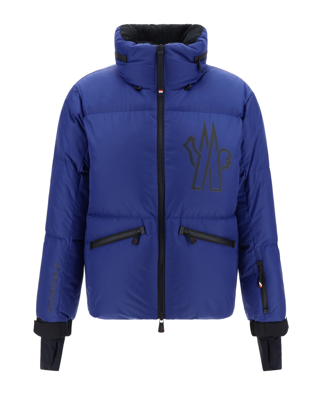 Verdons down jacket by moncler grenoble, high hooded crewneck, double-slider front zipper closure, two large side welt pockets, a vertical patch pocket on the left arm, contrasting elastic cuffs, all-over quilted and padded design, iconic brand monogram printed in contrast on the front and replicated on the back, regular fit.