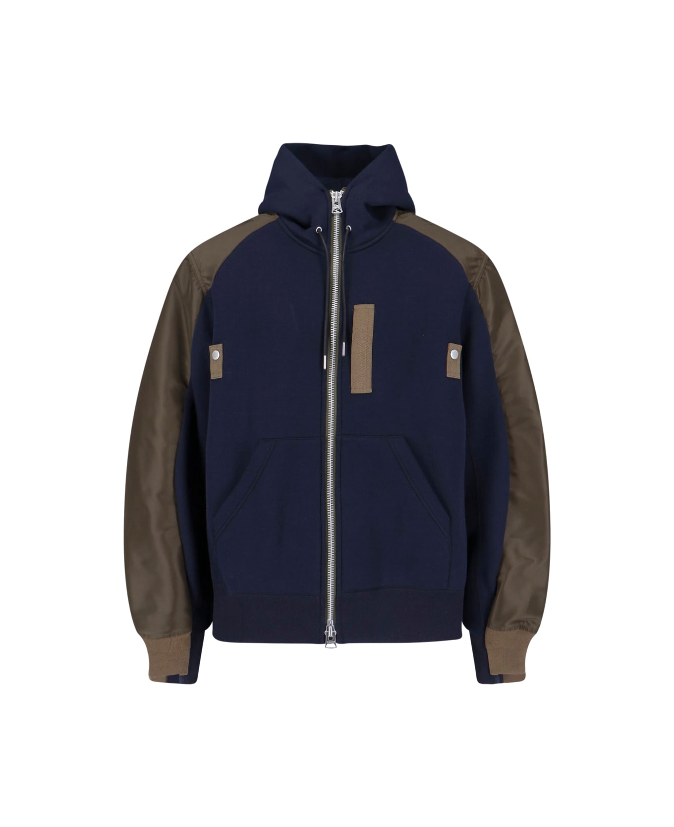 Sacai hooded jacket in blue and green cotton blend with drawstring hood, double zip closure, front patch details, one zip pocket on the sleeve, two side pockets, straight ribbed elastic hem.