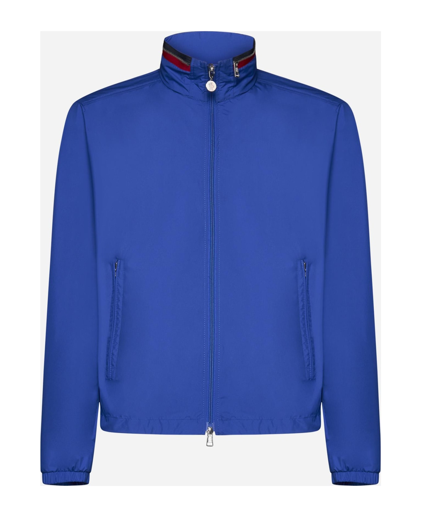 Moncler's Farlak blue nylon jacket featuring a high collar with back tricolor zip, front zip fastening, side zip pockets, elasticated cuffs, logo patch on the sleeve and waxed nylon lining.