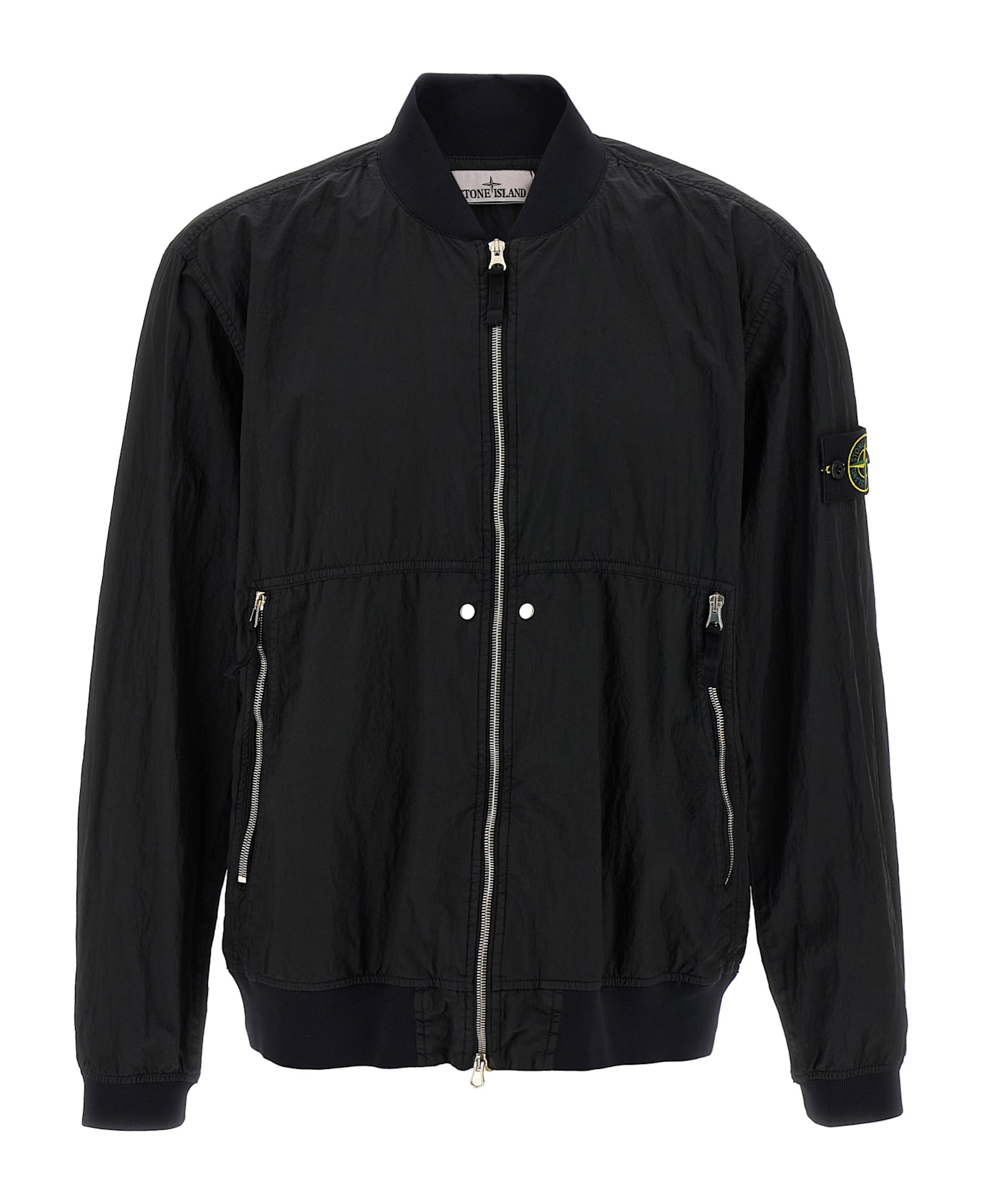 Wrinkled, windproof and rainproof nylon bomber jacket, zip pockets, front zip closure, long sleeves with knitted cuffs. Composition: 100% polyamide