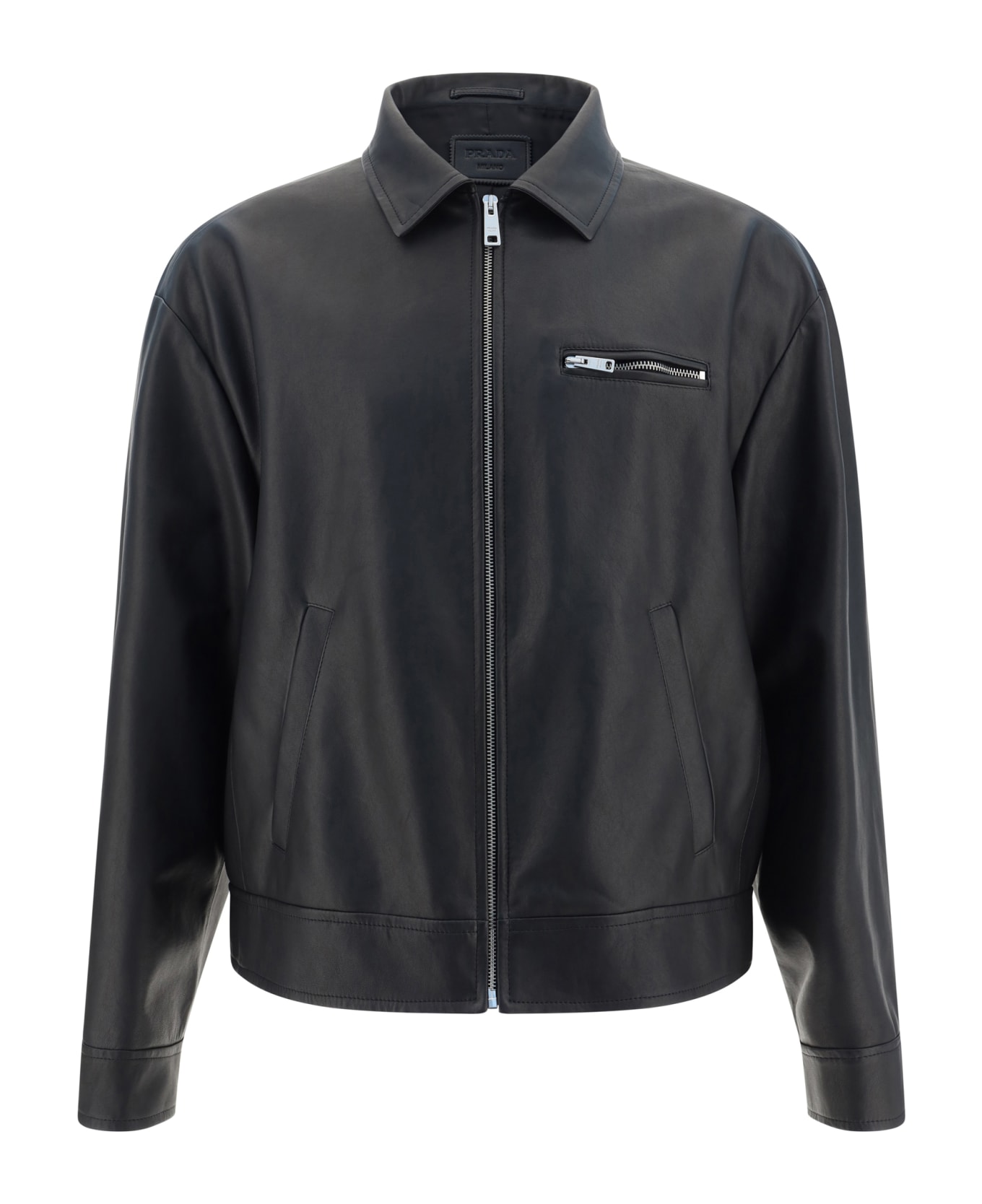 Lambskin jacket by prada, front zip fastening, a classic collar, two side welt pockets, a smooth leather design, a front welt pocket with a zip fastening, and a regular fit. Composition: 100% % Lamb Ovis Aries Aries
