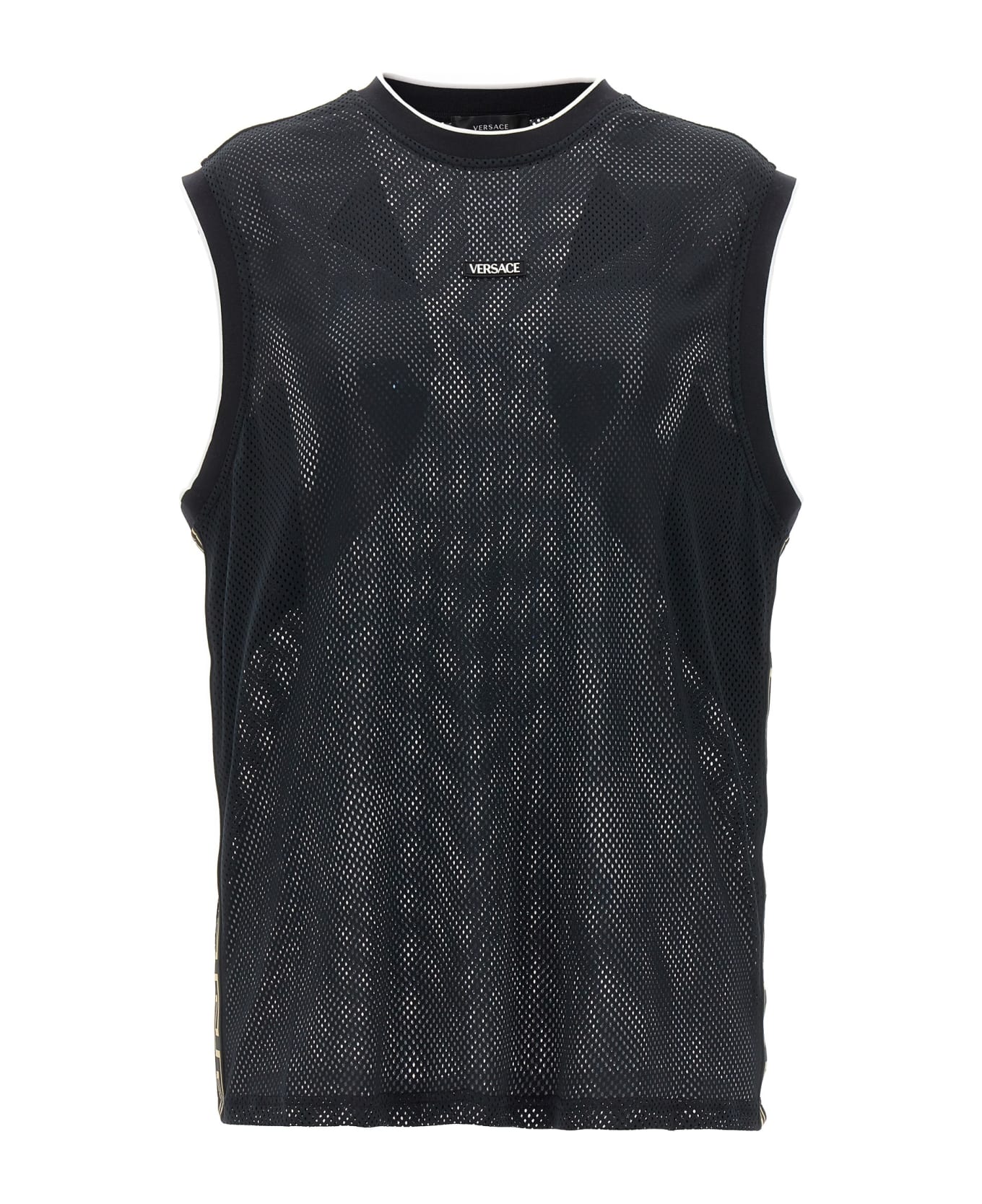 Mesh fabric tank top with 'Greca' print side bands, a front logo patch, crewneck, and a sleeveless style. Composition: 100% polyester