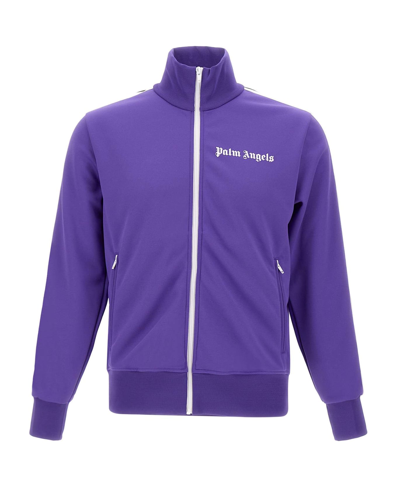 Palm Angels men's "Classic Track Jacket", purple, high collar, front fastening with zip, iconic black and white side bands on sleeves, two side pockets with zip, white logo print on chest, ideal for a sporty and trendy look. Made in Italy.