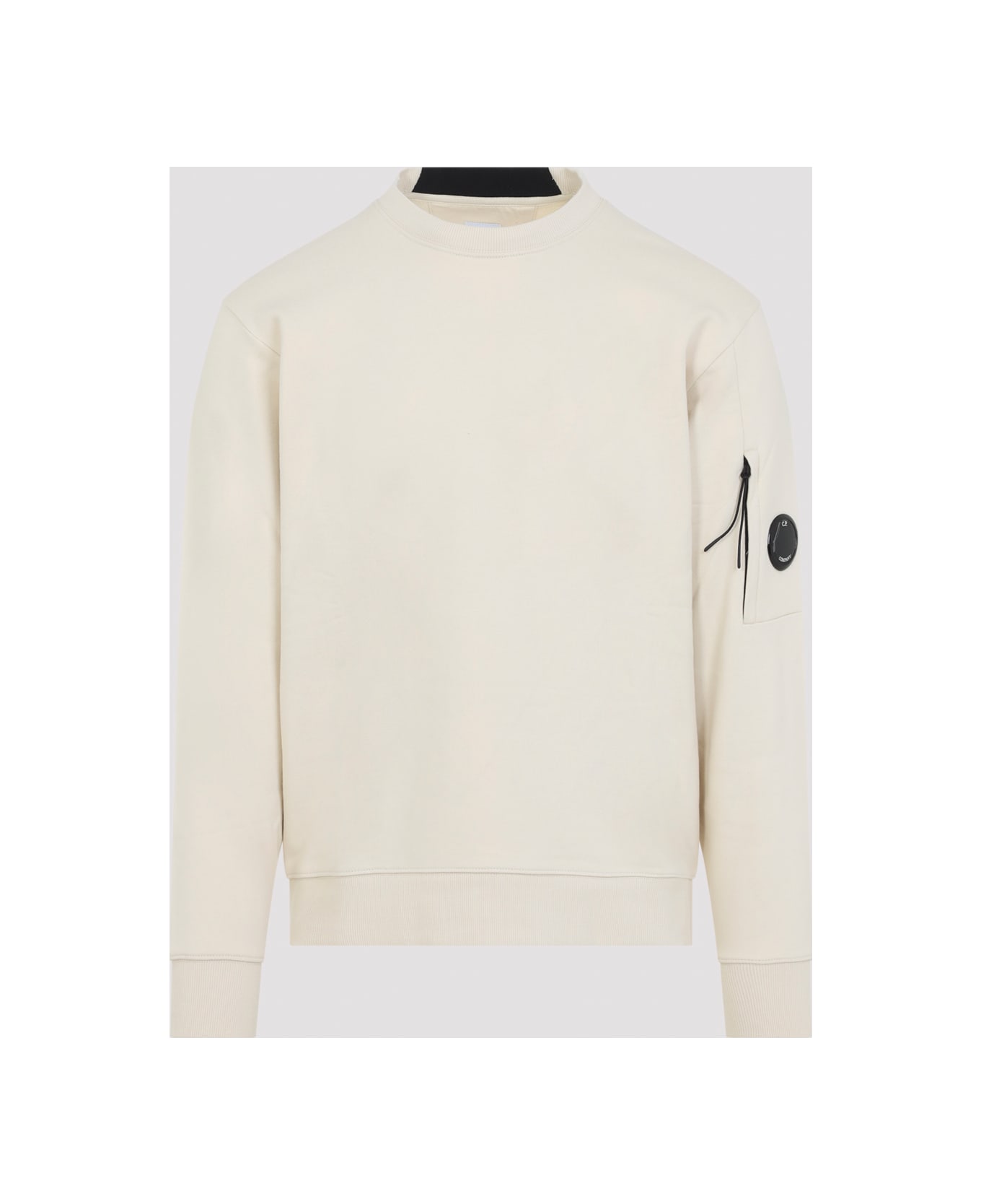 Cp Company Frozen Dew Cotton Sweatshirt. Crafted from cream brushed cotton, round neckline, long sleeves, zip pocket with Lens detail on the sleeve, fine ribbed edges, straight hem.