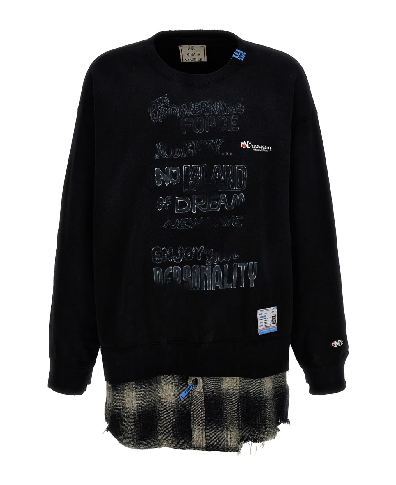 Cotton sweatshirt with front print, check print flannel insert, crew neck, long cuffed sleeves, frayed hem. Composition: 100% cotton