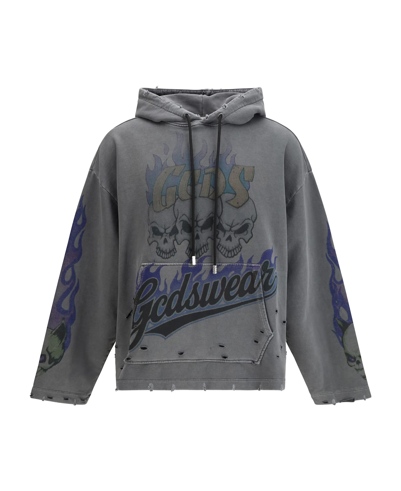 The hoodie with graphic print and drawstring hood by gcds blends urban attitude with contemporary character in a bold construction. the applied front pocket enhances its functional aesthetic, while the distressed-effect details add depth and personality to the design. the relaxed silhouette moves effortlessly, turning this hoodie by gcds into a distinctive piece with strong visual impact.
